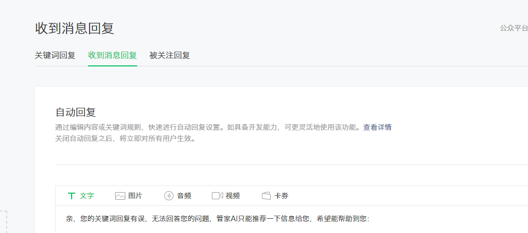 公众号怎么收到信息就回复啊,开了但是随机输入不会自动回复?