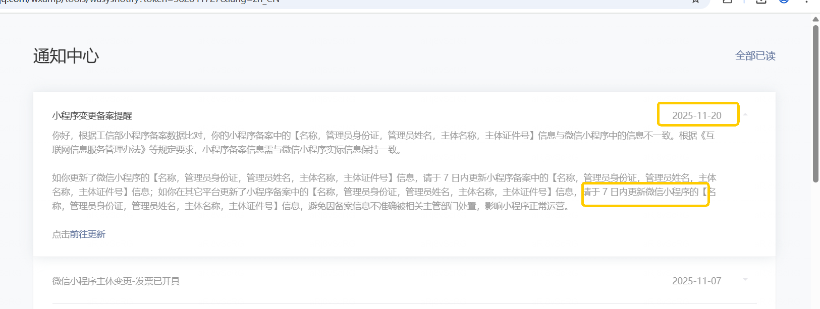 因主体变更需注销备案的,当前暂不影响小程序使用,注销后请尽快使用新主体重新发起备案,后续请开发者持续关注平台的公告、通知、站内信及模板消息等渠道。