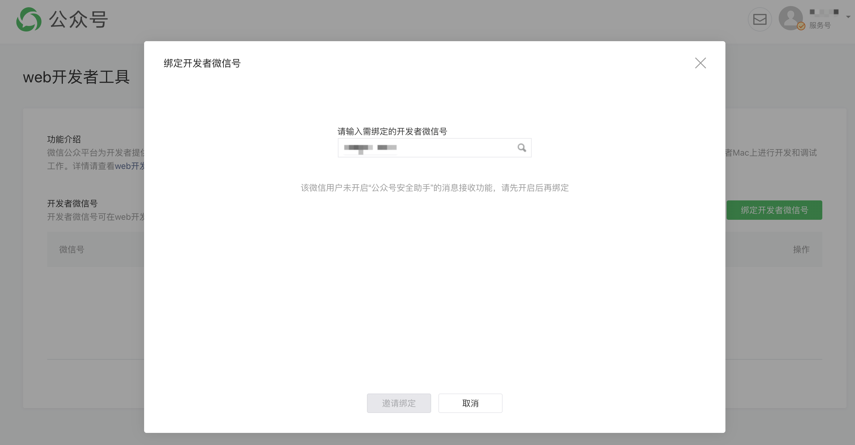 该微信用户未开启“公众号安全助手”的消息接收功能,请先开启后再绑定