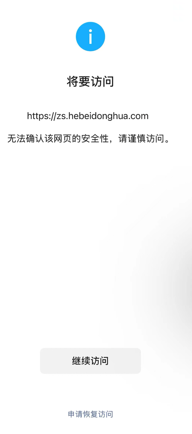 ICP备案,备案通过之后微信内访问就显示非官方页面,申请解除访问限制。https://zs.hebeidonghua.com/,在公众号后台绑定域名,认证为公众号,菜单绑定域名后,提示“非微信官方网页,请确认是否继续访问”,域名已经备案,且在公众号后台配置了业务安全域名,白名单,根目录等也已添加域名https://zs.hebeidonghua.com/麻烦解除一下网页请确认是否继续访问】