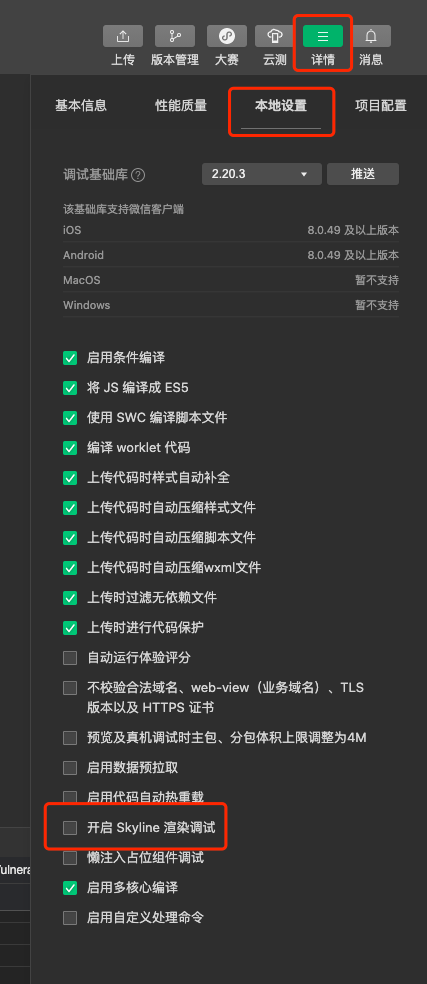 可以在详情——本地设置取消勾选「开启Skyline渲染调试」。