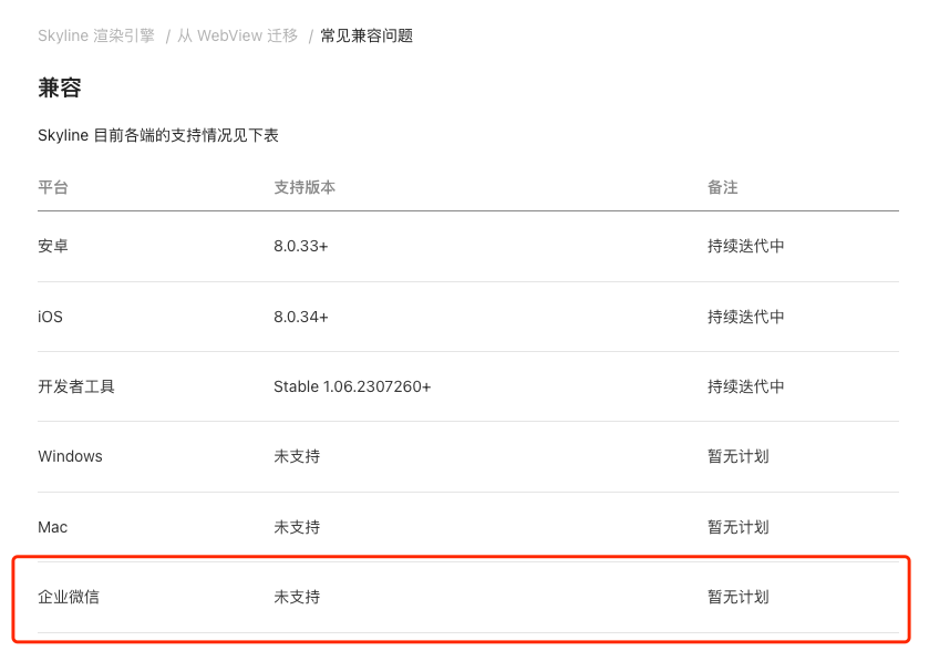 小程序模式是没问题的。。。切换到企业微信小程序模式就无法渲然页面了,请问skyline不支持这个问题怎么解决呢?