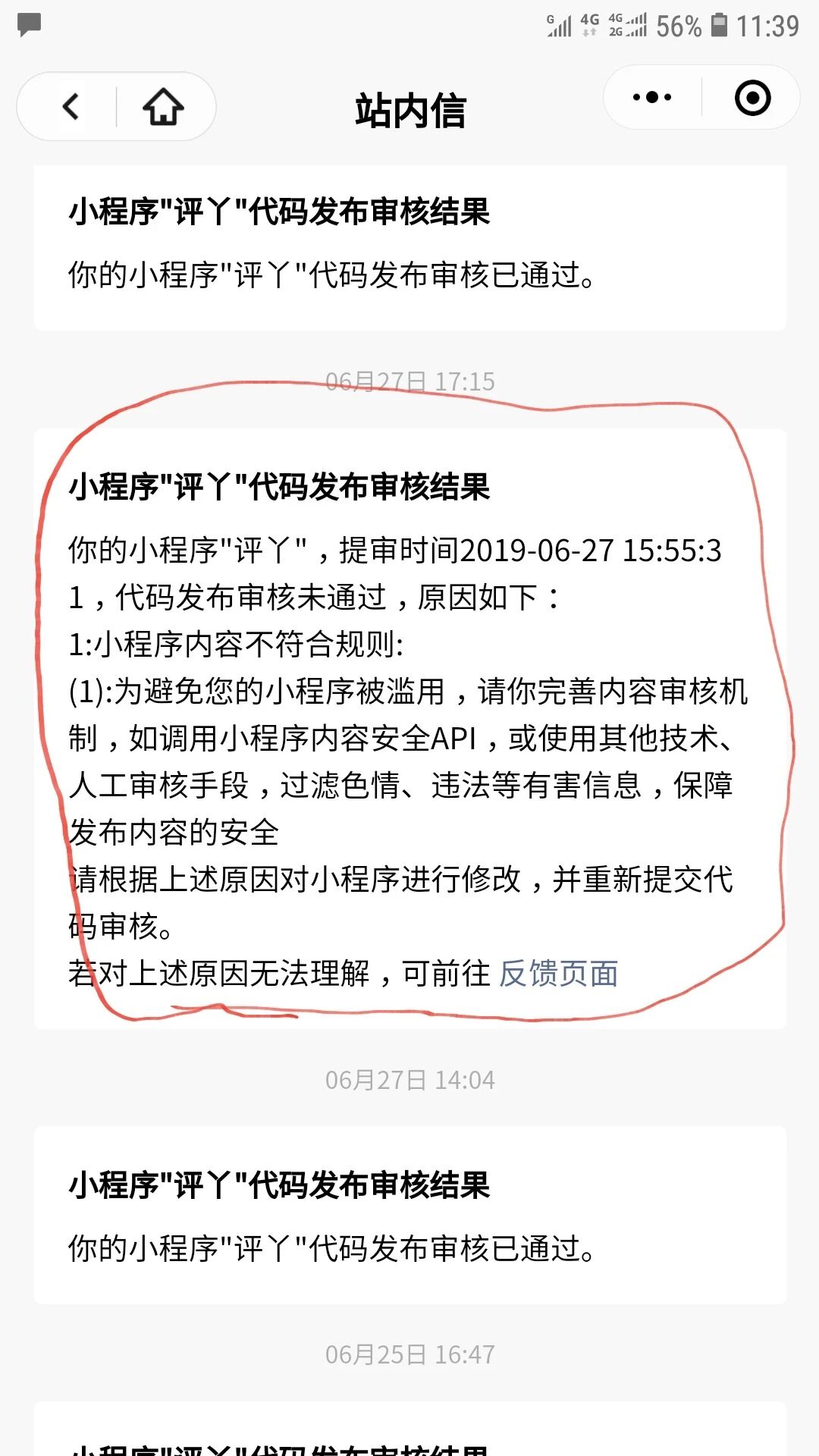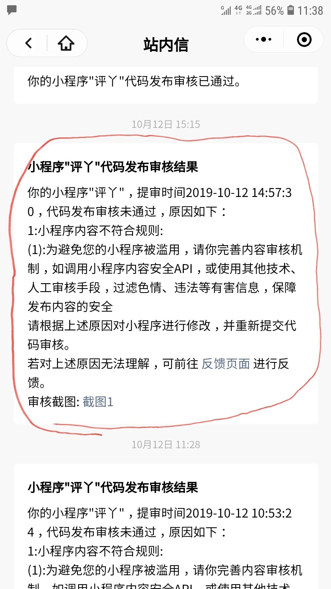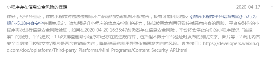 我公司的小程序的类型是问答,类似于 知乎。非常可能出现,用户发布 色情 垃圾 涉政 涉恐 广告 等违规信息。小程序官方多次通过“通知中心”提醒我们:“请你完善内容审核机制,如调用小程序内容安全API,或使用其他技术、人工审核手段,过滤色情、违法等有害信息,保障发布内容的安全”,如下面截图: