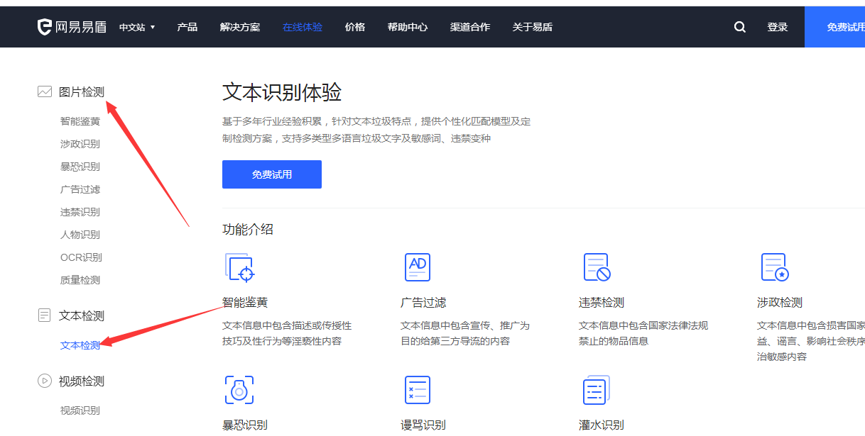网易易盾的文本安全检测和图片检测 的介绍如下:https://dun.163.com/trial/text