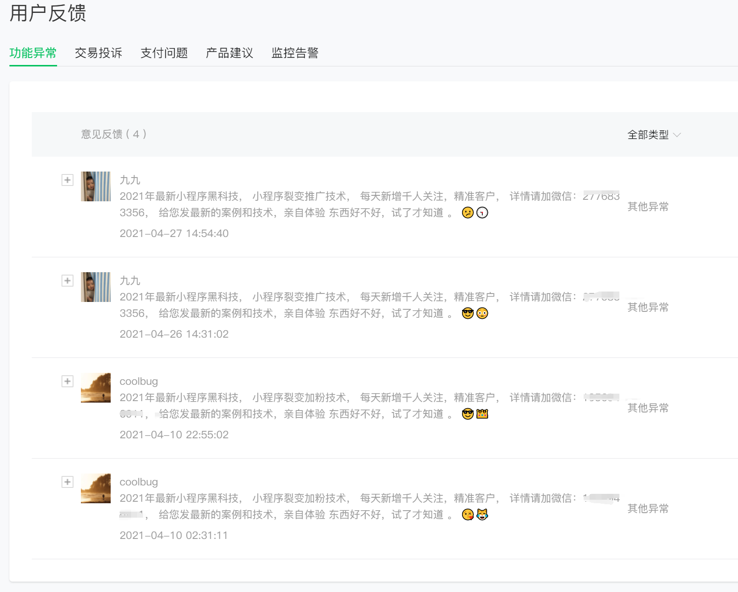 经常从反馈页面或客服聊天窗口收到这种垃圾广告,真是无孔不入,特别恼火。后台好像没有拉黑功能,能屏蔽这些恶心的帐号吗?求解
