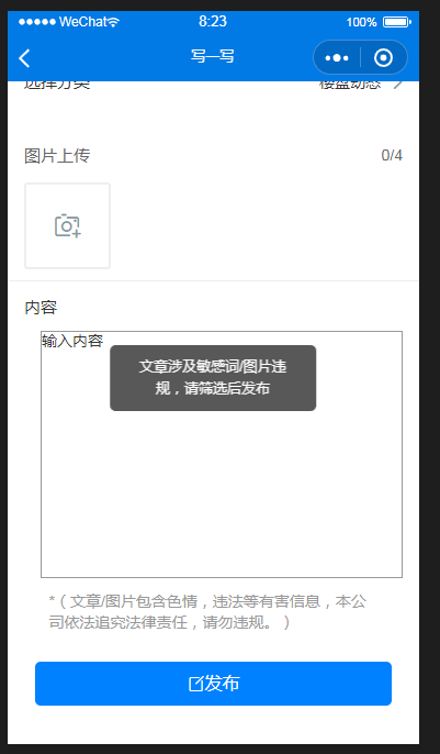 你好,经核实,你的帐号确实存在涉嫌未设置过滤违法、违规等不当信息内容的机制,请自觉遵守国家相关法律法规,不从事违法或违反《微信小程序平台运营规范》及相关规则的内容和行为(标题内容可输入违规信息),谢谢。