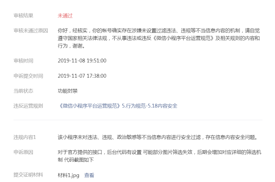 第一次更改申诉后,得到这样的回复,仔细排查后重新审核发布也成功了也过滤了敏感信息也增加了人工后台审核希望官方能解除封禁,不然我一个前端要背锅了- - 感谢