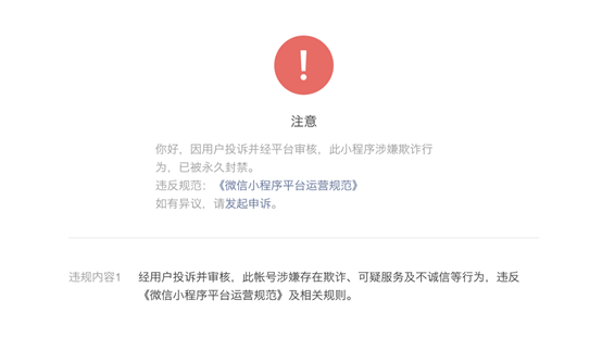 后端提示:经用户投诉并审核,此帐号涉嫌存在欺诈、可疑服务及不诚信等行为,违反《微信小程序平台运营规范》及相关规则。