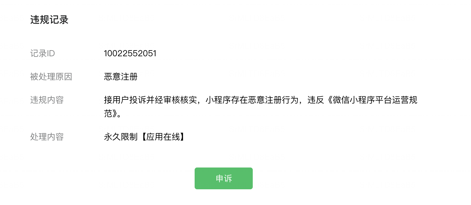 我刚刚注册开发的微信小程序被封号,appid wx1b05b9761826a203