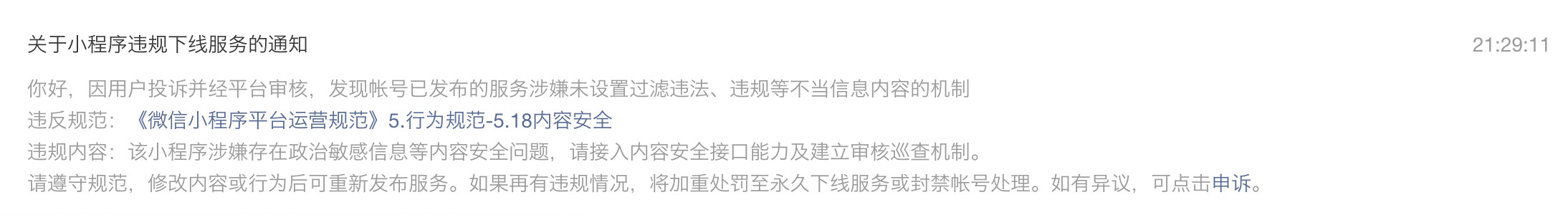 【急】26号前已经接入公司内部的色情、黄暴、政治敏感等审核机制,并结合人工审核。但是28号晚上还是收到服务下线的通知,这个如何解决?通知内容如下: