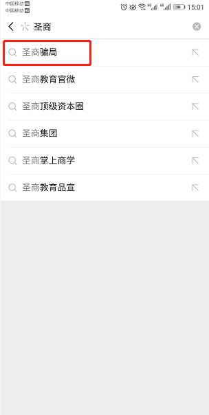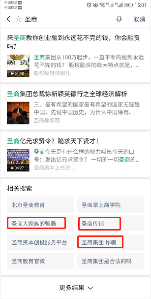 在搜一搜里搜索“圣商”时出现:圣商骗局、圣商大家族的骗局、圣商传销、圣商集团 诈骗;这样的字眼,严重影响了我公司的名誉,目前对我公司造成了严重的影响,希望贵平台能帮忙处理,我公司愿意提供相应的证件;