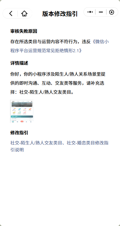 ps: 后续若申请【社交-陌生人/熟人交友类目】报备类目,涉该报备类目首次提审代码,需进入报备审核,预计审核时长7*24h;届时可支持预上线,请合理安排小程序上线时间。