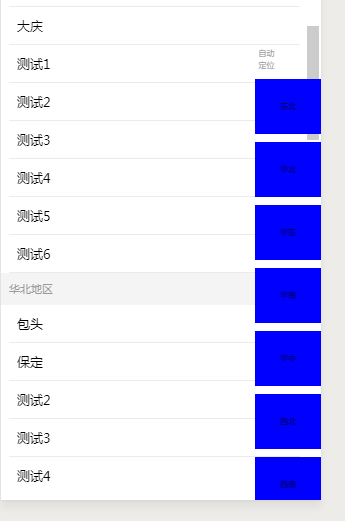 <scroll-view class="content" scroll-into-view="{{toView}}" scroll-y="true" scroll-with-animation="true"> <view wx:for="{{act_addList}}"> <view class="address_top" id="{{ 'inToView'+item.id}}">{{item.region}}</view> <view wx:for="{{item.city}}"> <view class="address_bottom">{{item.name}}</view> </view> </view></scroll-view><view class="orientation_region"> <view class="orientation">自动定位</view> <block wx:for="{{orientationList}}"> <view class="orientation_city" bindtap="scrollToViewFn" data-id="{{item.id}}">{{item.region}}</view> </block></view> |