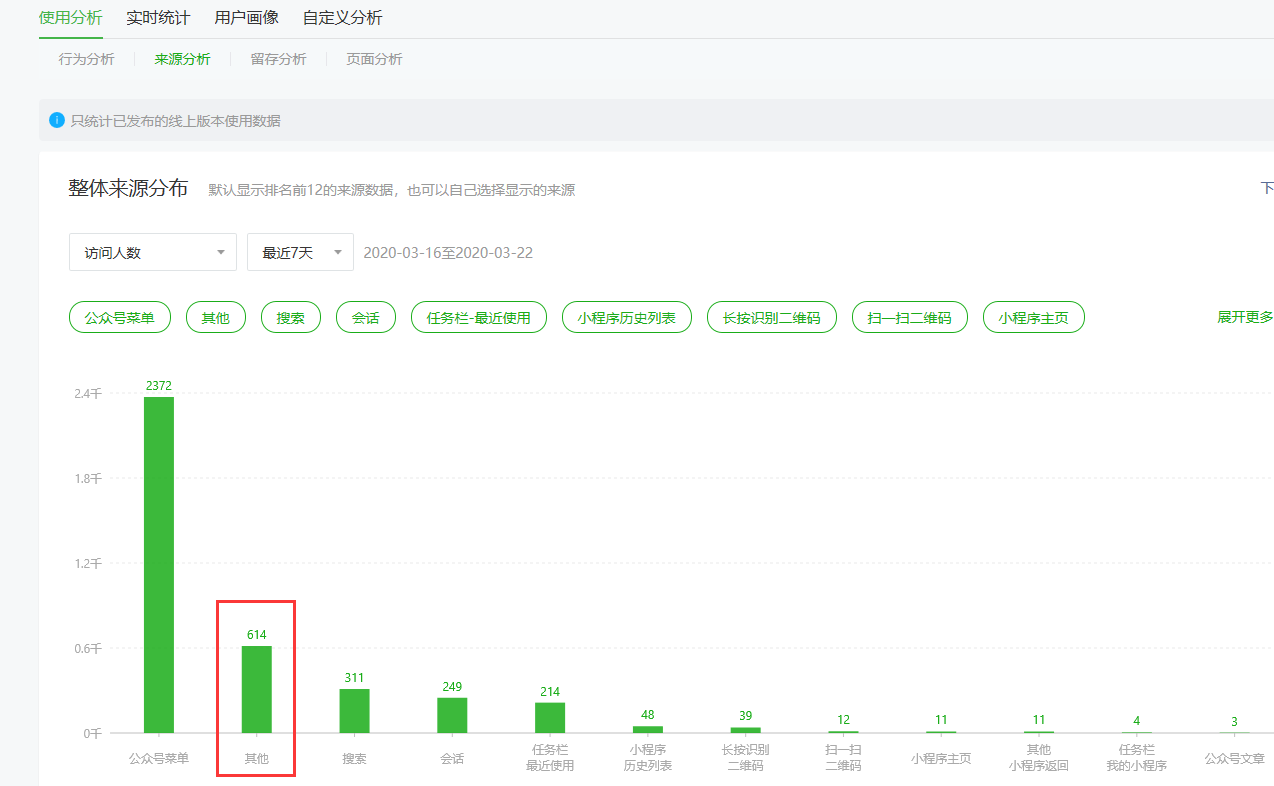 小程序访问来源非常多,后台会对一些场景做合并汇总统计。“其他”可能包括一些平台未开放的、或用户量较小的、或上报缺失的来源(目前包括广告,卡券领取、连wifi成功提示页、一维码、聊天记录等)。对于重要场景,平台会逐个拆分统计展示。