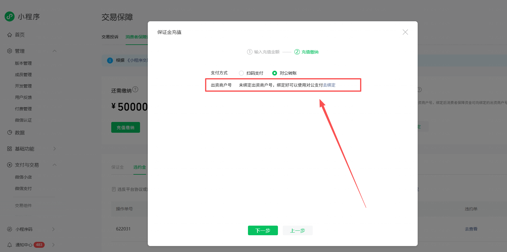 1、绑定中操作:扫码确认开通功能→ 需登录【微信支付商户平台】(https://pay.weixin.qq.com) → 进入【消息中心】→ 找到【小程序保障资金缴纳功能开通确认】通知 → 使用商户超管员身份微信号扫码确认(超管员微信需关注【微信支付商家助手】公众号)。