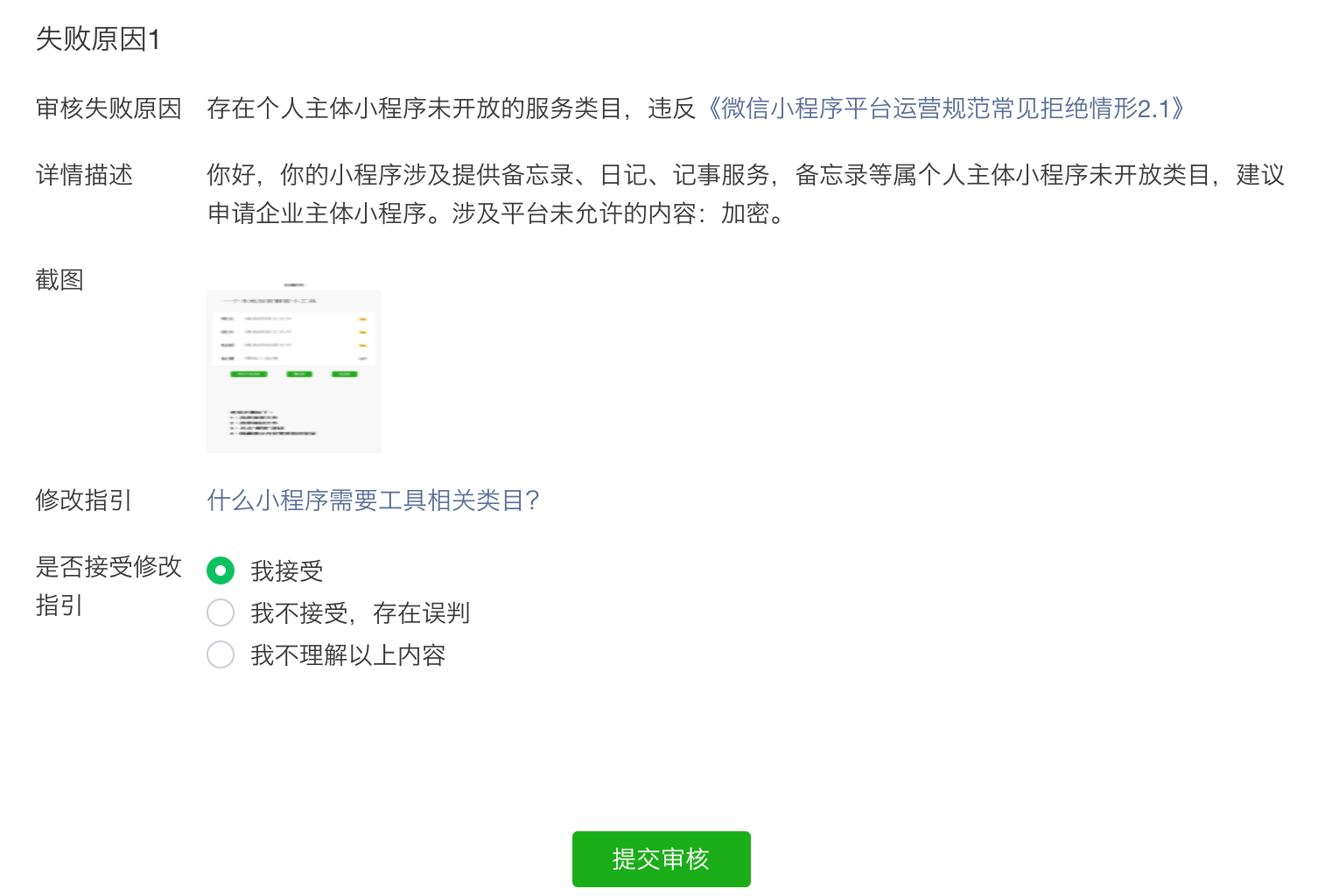 1.小程序涉及提供备忘录、日记、记事服务,备忘录等属个人主体小程序未开放类目,建议申请企业主体小程序或去掉相关内容后再提交审核。
