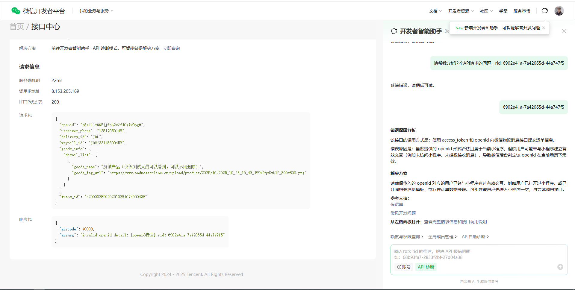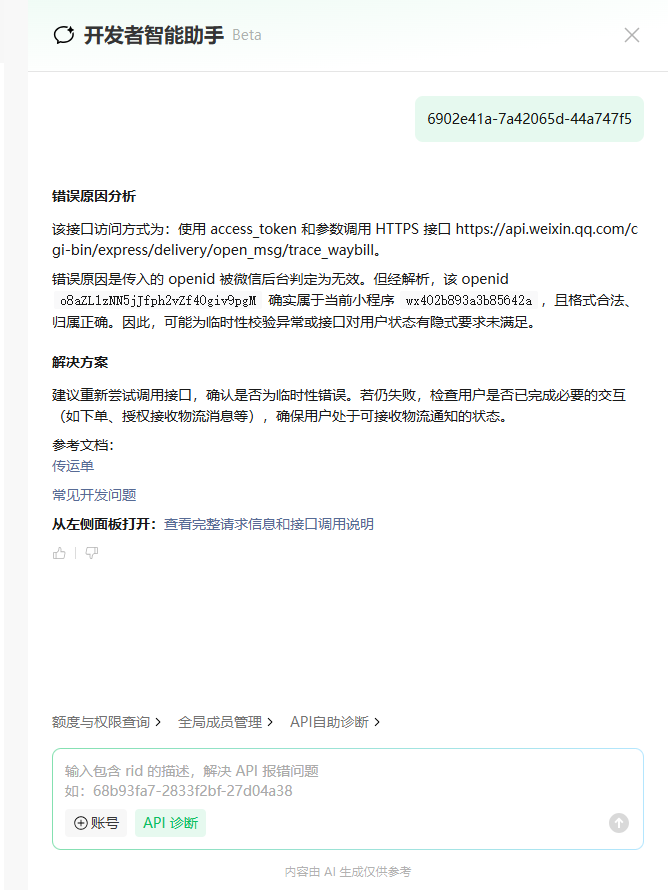 平台已上线 api 智能诊断功能,后续遇到服务端接口报错的问题,可通过rid一键智能诊断,详情可查看:https://developers.weixin.qq.com/doc/oplatform/developers/basic_func/aibot.html