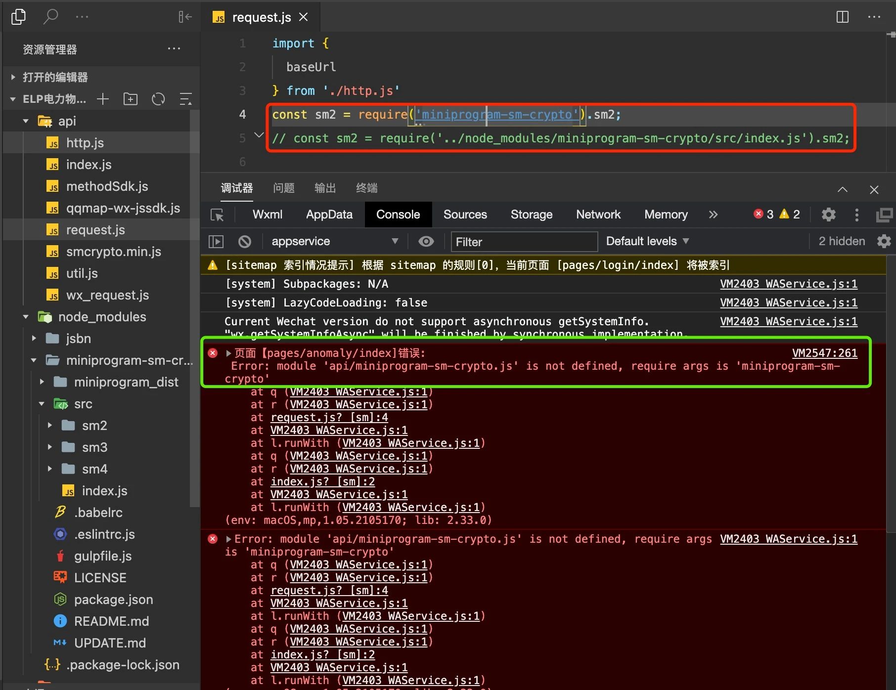 小程序npm install --save miniprogram-sm-crypto 后,在js中require 运行后报错了,如图所示;这种情况如何解决?