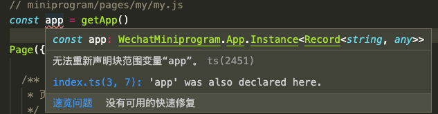 let App = getApp()Page({})// vscode 的提示:// 无法重新声明块范围变量“App”。ts(2451)// lib.wx.app.d.ts(248, 15): 'App' was also declared here.// 链接到官方的类型声明处是:// declare const App: WechatMiniprogram.App.Constructor// declare const App: WechatMiniprogram.App.Constructor