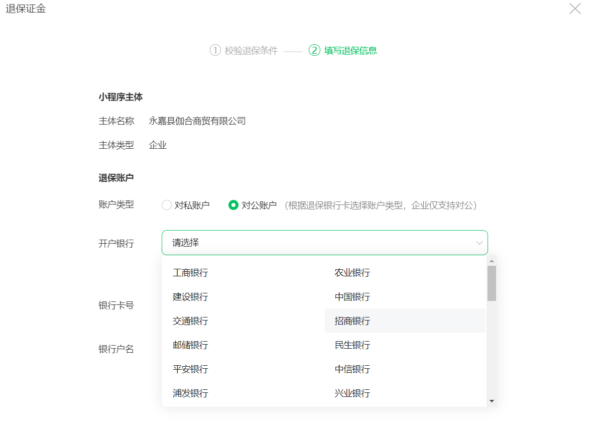 没有显示的银行列表就代表不支持退保到该银行,但商家可通过发送邮件申请退保到公司法人的银行卡上,商家发完邮件再线上提交退保信息,同时记得下架小程序:在小程序管理后台https://mp.weixin.qq.com/ 账号设置-基本设置-账户信息-暂停服务 (状态显示已暂停服务)