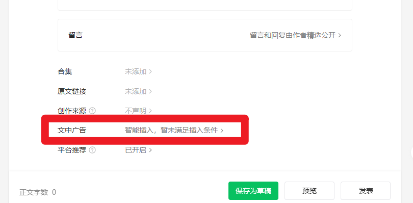 编辑内容的时候,把文中广告设置为“不展示文中广告”即可。