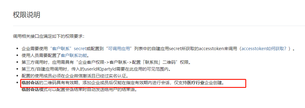 你好,看日志配置的是"type":1,"scene":2,"skip_verify":true,"user":["linger"],"party":[],"is_temp":true} 有临时会话二维码,这个目前仅支持医疗行业创建的,你这个企业所在行业不是医疗行业
