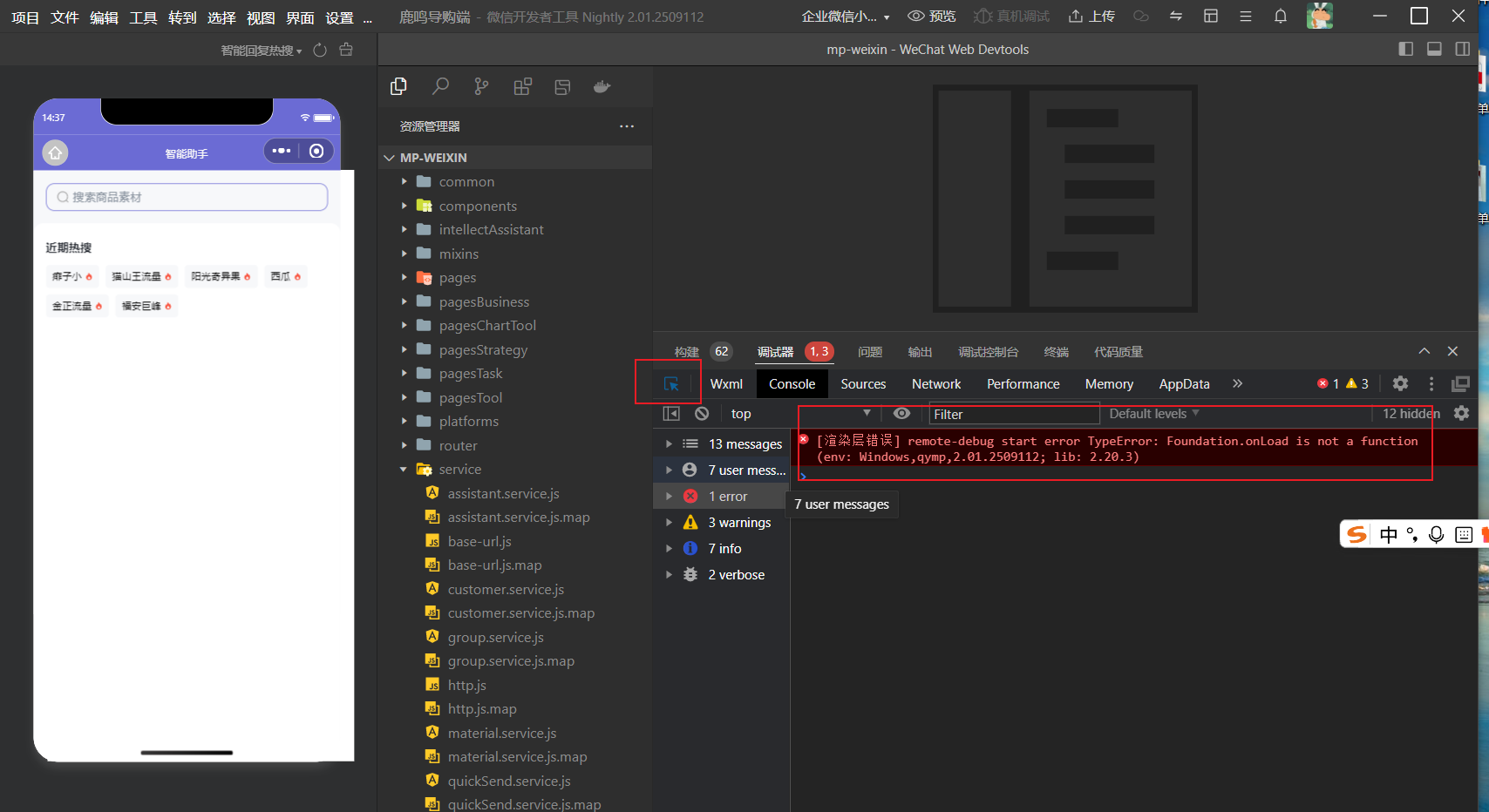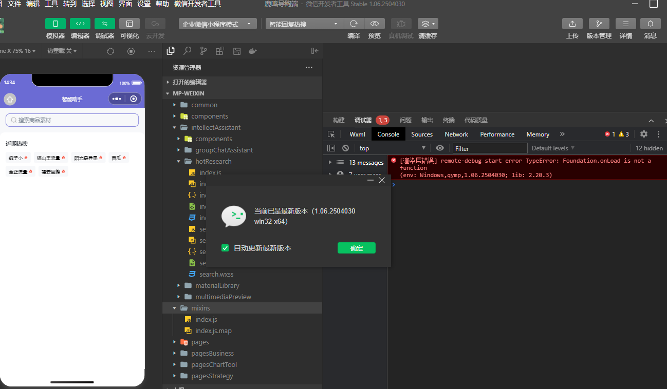 新版开发工具总是提示 [渲染层错误] remote-debug start error TypeError: Foundation.onLoad is not a function(env: Windows,mp,1.06.2504010; lib: 2.17.0)