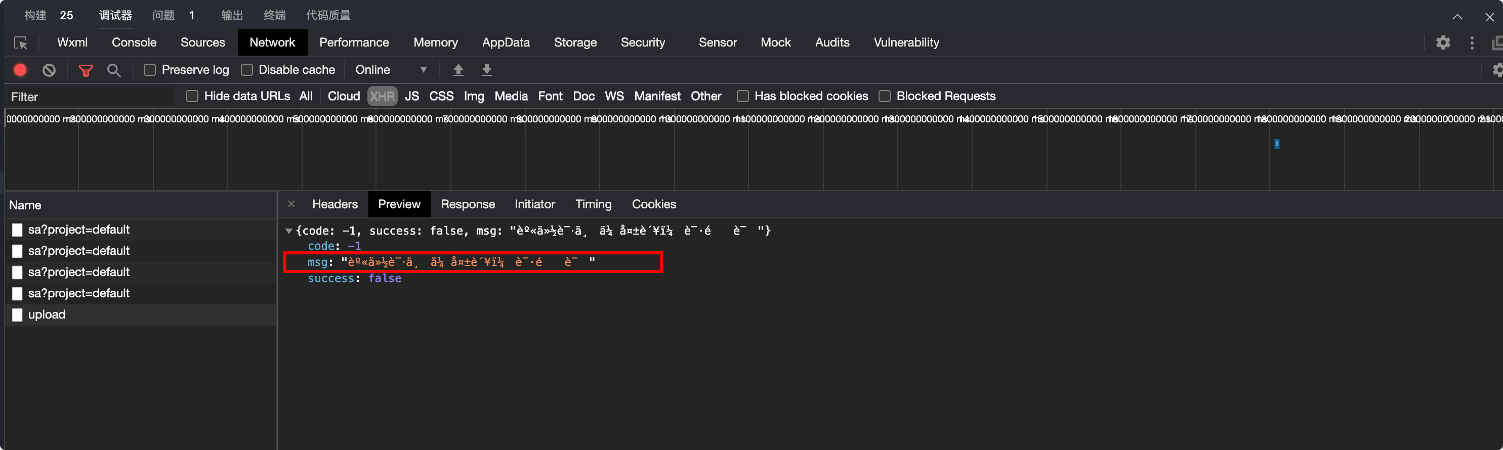 接口返回了错误信息,但是开发者工具上显示的是乱码,如下图所示,但是我问了我同事的,他的开发者工具上显示的是正常的。所以排除了服务端编码的问题。唯一不同的是我的是Mac,他的是windows环境,求解!!!!