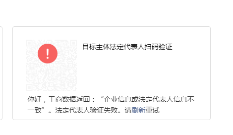 你好,工商数据返回:“企业信息或法定代表人信息不一致”。法定代表人验证失败。请刷新重试