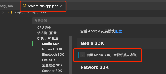 你看下是否有在 project.miniapp.json 文件里 安卓和iOS 的「扩展SDK配置」里面都勾选「Media SDK」呢?