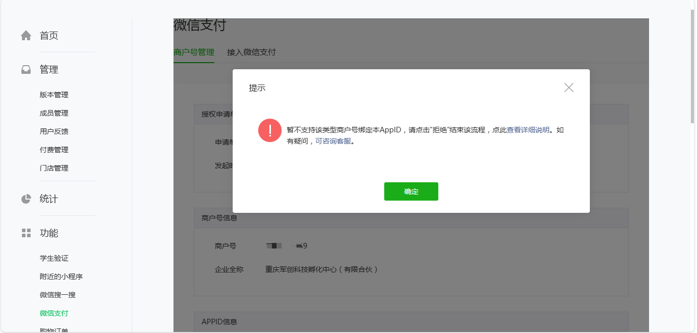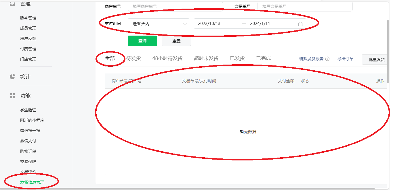 在小程序公众平台后台的”发货信息管理“里没有任何发货信息,同时微信支付也被停止了,微信小程序“微信支付”——“待关联商户号”列表中“确认”绑定相对应的微信支付商户号时又提示“暂不支持该类型商户号绑定本AppID”。因都是在线测试订单数据,在“发货信息管理”点击“特殊发货报备”选择“测试订单”时要求填写待发货状态的商户单号或交易单号,可是我在“发货信息管理”列表中又根本无法查询到任何订单,怎么填写??请尽快帮助解决。