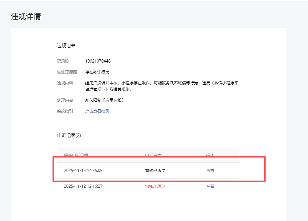你好,经核实,申诉结果已通过站内信下发,可登录微信公众平台查看申诉结果,感谢反馈。