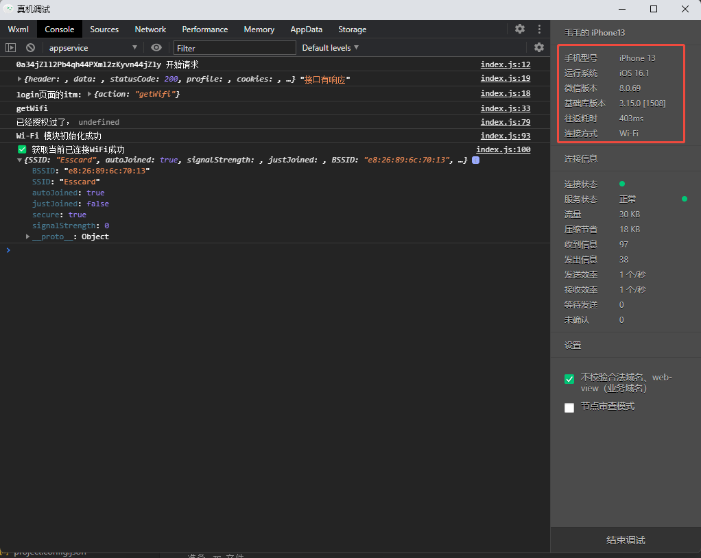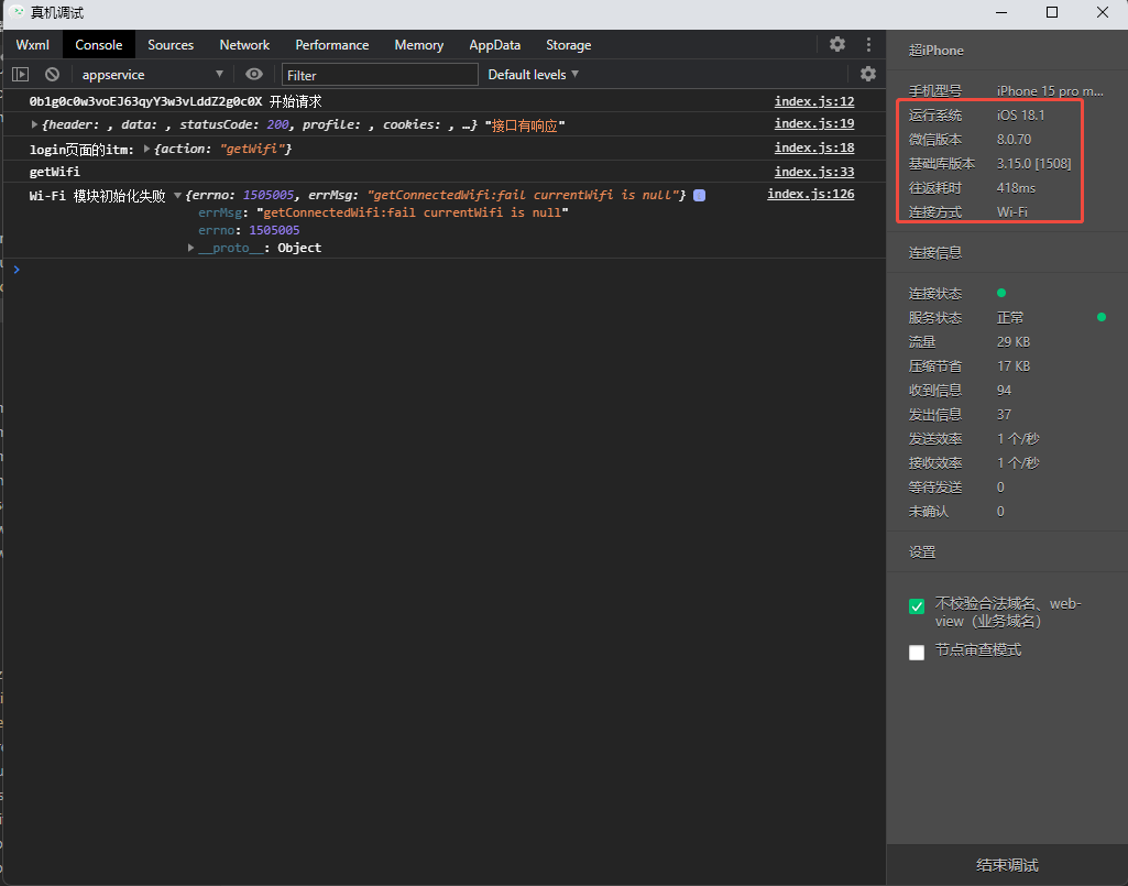 确认当前ios手机已经连接wifi,调用wx.getConnectedWifi该API时,会返回1505005的报错码。 用自己的另一部ios手机,同样的账号,就可以正确返回当前已连接的wifi信息 当2026年3月25日重试后,以上两种机型均获取不到BSSID(环境:微信版本8.0.70、8.0.69,确认已经设置了定位权限及连接了无线网络,但此无线网络为802.1X的无线网)
