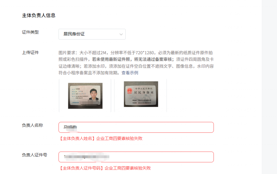 小程序备案前营业执照变更了法人,变更之后再国家企业信用信息公示系统可以查询到变更的法人后去申请备案,备案第一步上传主体负责人信息时提示【主体负责人姓名】企业工商四要素核验失败,【主体负责人证件号码】企业工商四要素核验失败,需要怎么解决