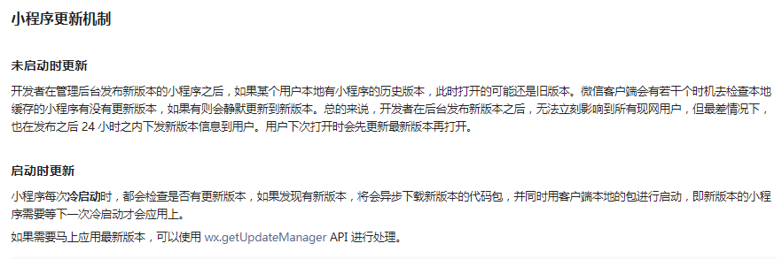 详细请参考 https://developers.weixin.qq.com/miniprogram/dev/framework/runtime/update-mechanism.html