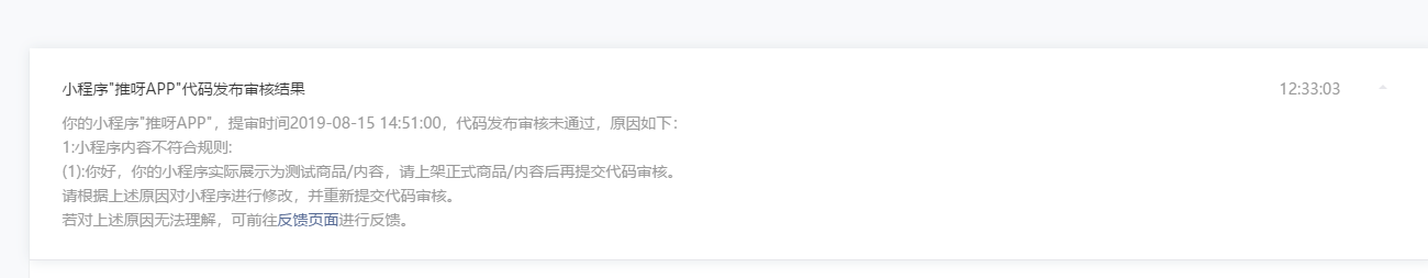 你好,经核实,贵方小程序打开后只有title和底部button,无具体运营内容,无法体验实际服务,请上架完整内容后再提交代码审核(详图如下)