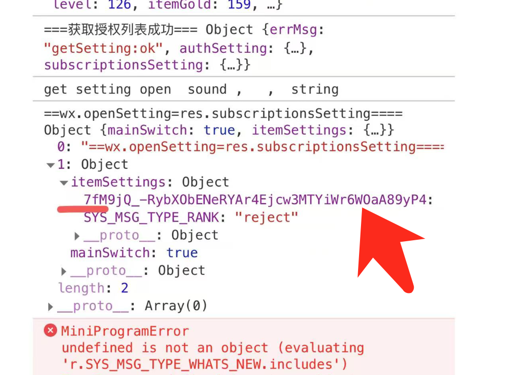 使用小游戏系统更新提醒功能,微信getSetting返回的如上说明没问题,但是使用wx.openSetting返回的订阅数据key变成了7fM9j0 -RybXObENeRYAr4Ejcw3MTYiWr6w0aA89yP4,这是为什么????