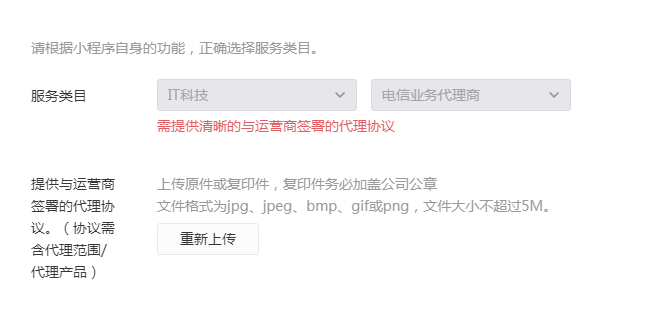 公司新开发了一个配合行车记录仪使用的小程序,主导车机定位,行车历史,行车视频的数据查看,因为车机需要流量来实现这些数据上传,所以在小程序内有一个流量套餐购买的功能。之前提交小程序审核的时候让我们选择电信业务代理商类目,现在添加类目一直说我们公司上传的协议不清晰,我们上传的都是扫描件,文字和章都是很清楚的