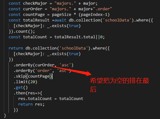 db.collection('schoolData').aggregate().addFields({isEmpty: $.ifNull(['$'+curOrder, 999999])}).sort({isEmpty: 1,order: 1,}).end()