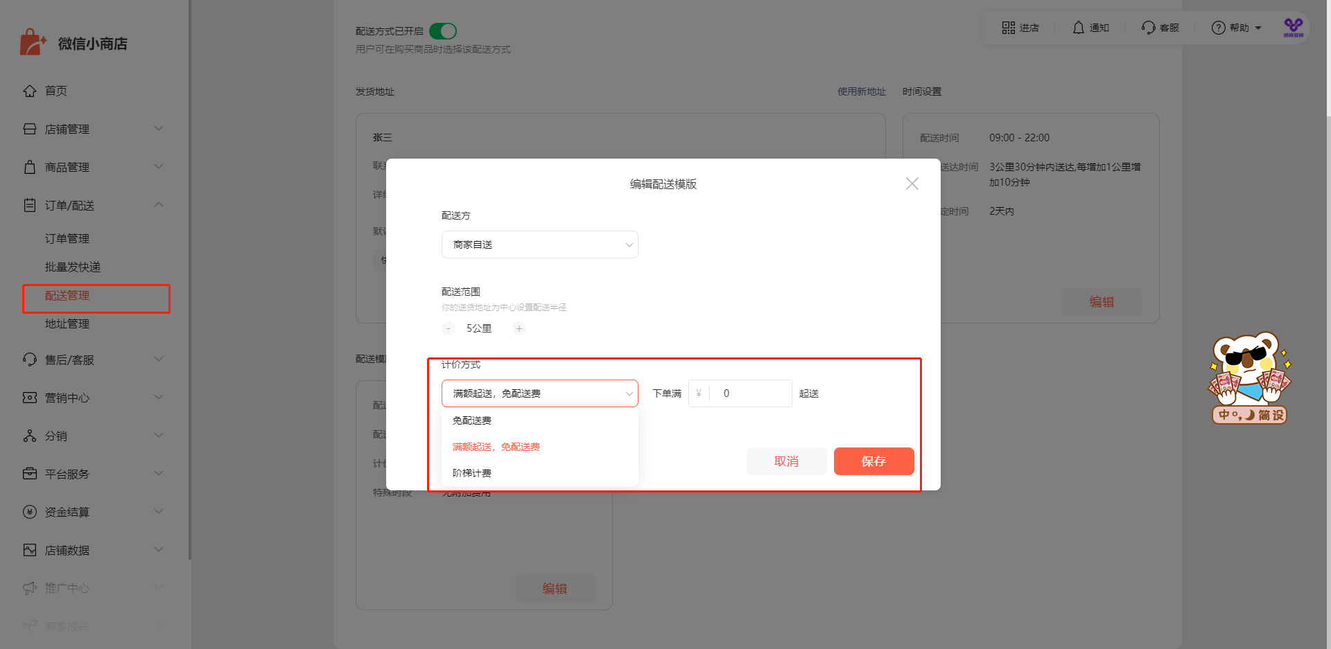 您好,可以在小商店PC端后台-【地址管理】-【同城配送】-【配送模板】的计价方式里面设置起送价或阶梯计价