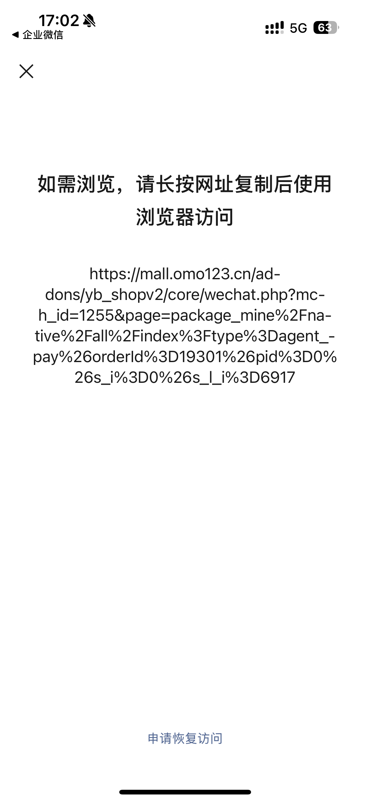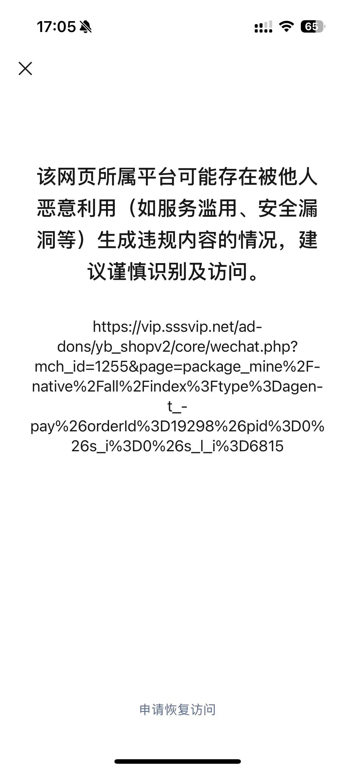 刚开始使用是好的,然后突然不能正常访问了,公众号首页链接 https://mall.omo123.cn/addons/yb_shopv2/h5/1255/#/yb_shopv2/native/tabbar0/index,然后分享给好友,使用代付功能,好友打不开 提示该网页所属平台可能存在被他人恶意利用(如服务滥用、安全漏洞等)生成违规内容的情况建议谨慎识别及访问? 怎么解决呢