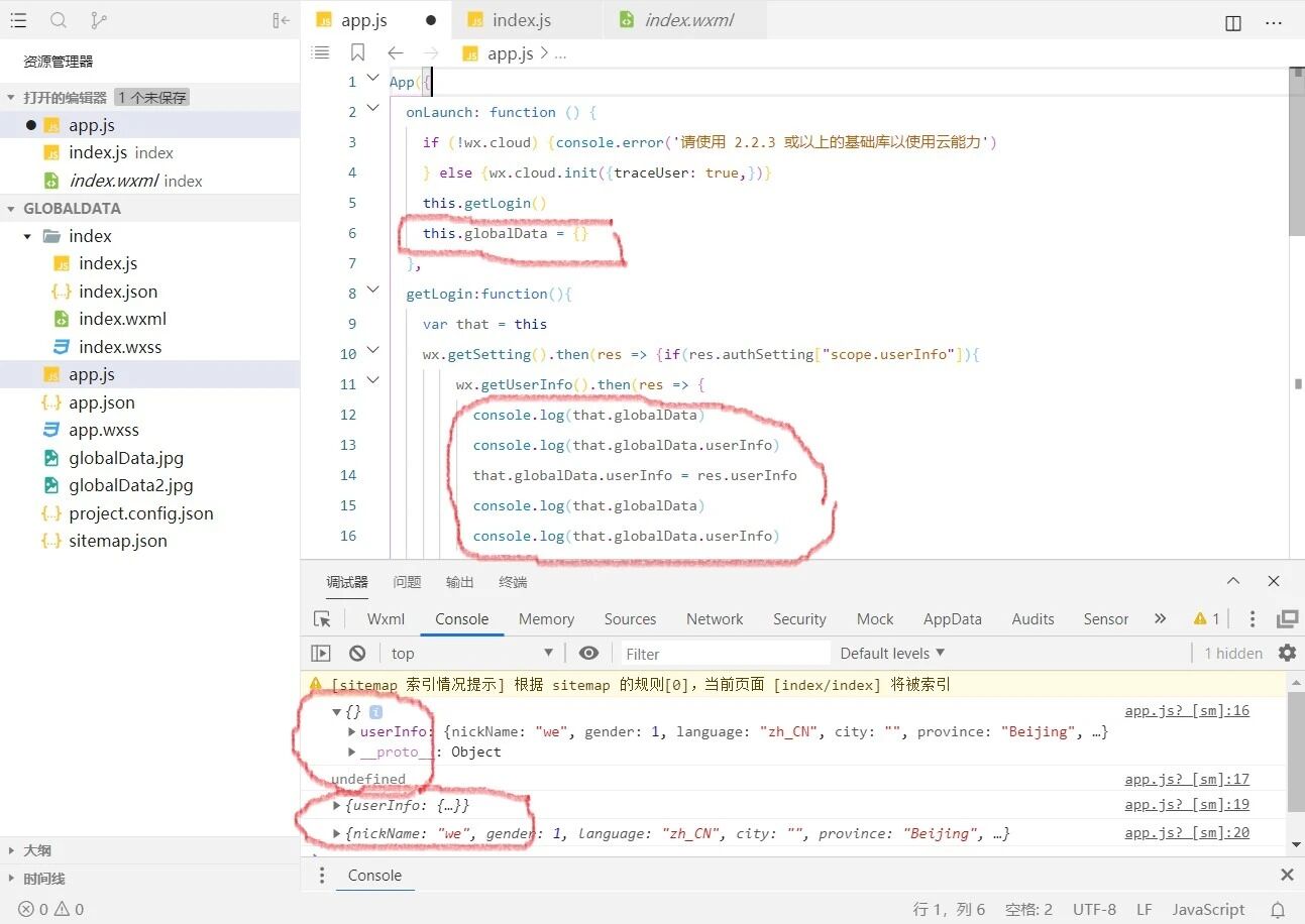 我在index.js页面获取globalData的数值结果与赋值语句前面的两个console一样,不知道怎样才能在index.js中获取正确的数值