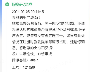 还是没有答复,腾讯客服也提交了人工的单子。回复的很官方。 现在注册小程序的邮箱被提示占用,按照说明去解绑又说没有注册。