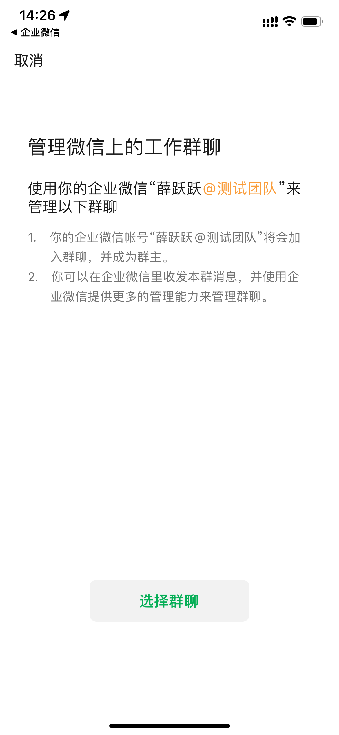 之后选择微信群后,就可以替换为企业微信身份管理群聊。如图: