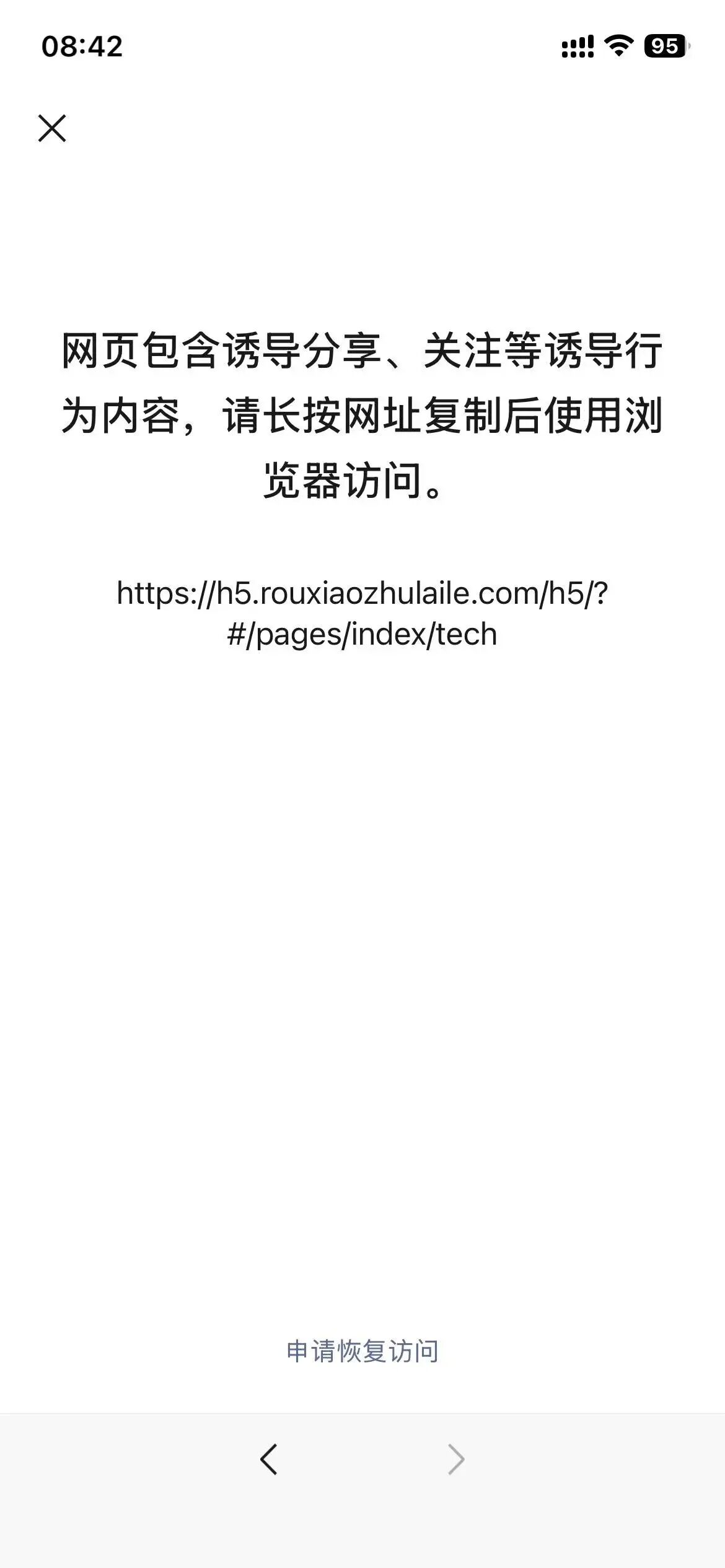 你好,经审核,域名【rouxiaozhulaile.com】下的链接【https://h5.rouxiaozhulaile.com/h5/?#/pages/index/tech】的内容存在违反《微信外部链接内容管理规范》的第2.1条“诱导分享类内容”,请对相关内容修改后进行申诉;申诉方式可点击停止访问页底部入口进行操作,我们会在三个工作日处理,请耐心等待。 详细规则请参考《微信外部链接内容管理规范》http://weixin.qq.com/cgi-bin/readtemplate?t=weixin_external_links_content_management_specification