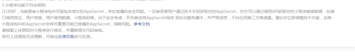 开发者你好,经核实你的提审小程序包中确实包含你的或你的合作伙伴小程序的AppSecret,根据安全原则,任何小程序AppSecret都不应存放在前端,建议你和你的合作伙伴可通过关键词定位等方式排查并去除小程序包中的AppSecret字样并重置可能已泄漏的AppSecret,消除风险。
