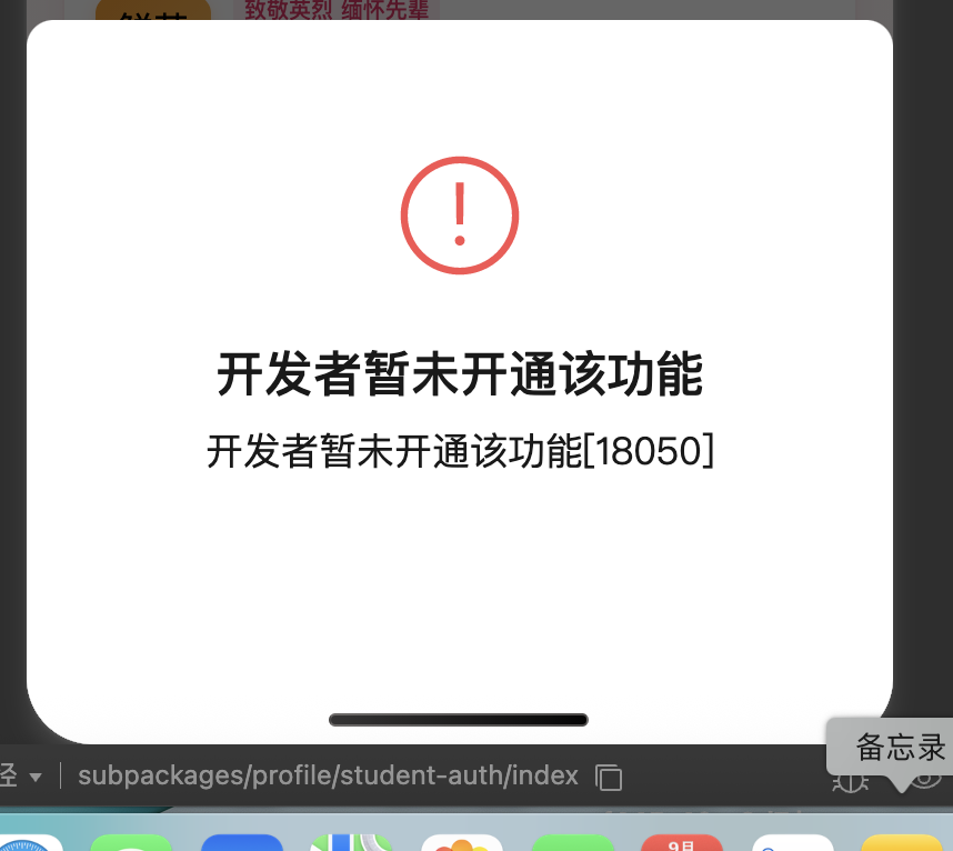 appservice.js:1403 studentidentity get failWording {isSysErr: true, ret: 18050, title: "开发者暂未开通该功能", desc: "开发者暂未开通该功能[18050]", primary: "重新验证", …}(env: macOS,mp,1.06.2504030; lib: 3.8.12)