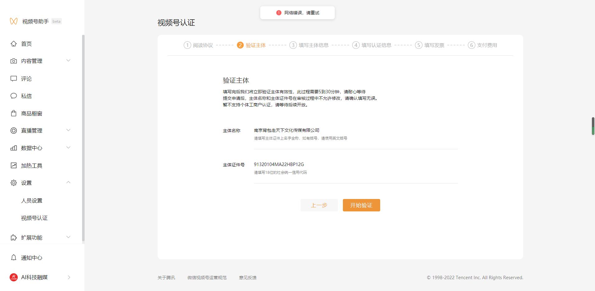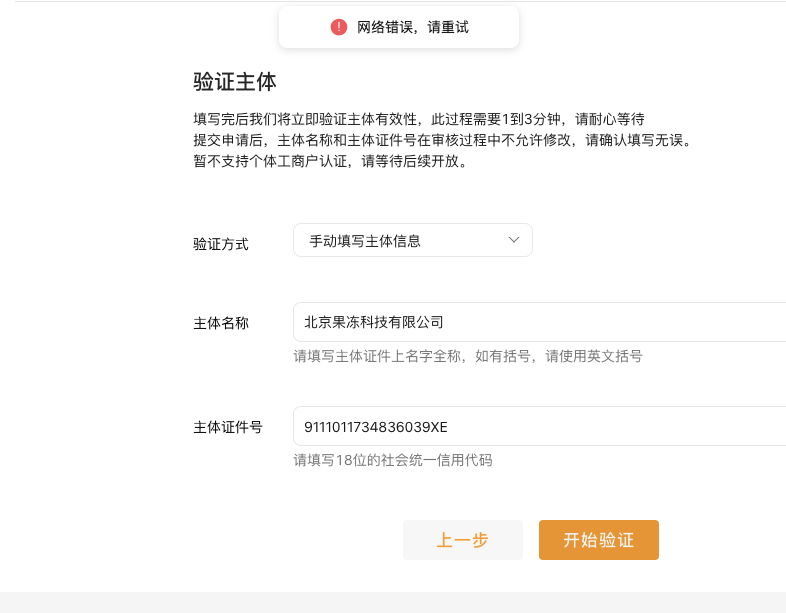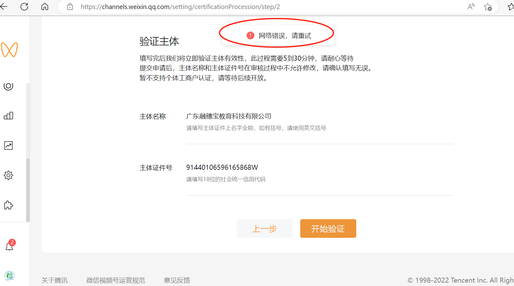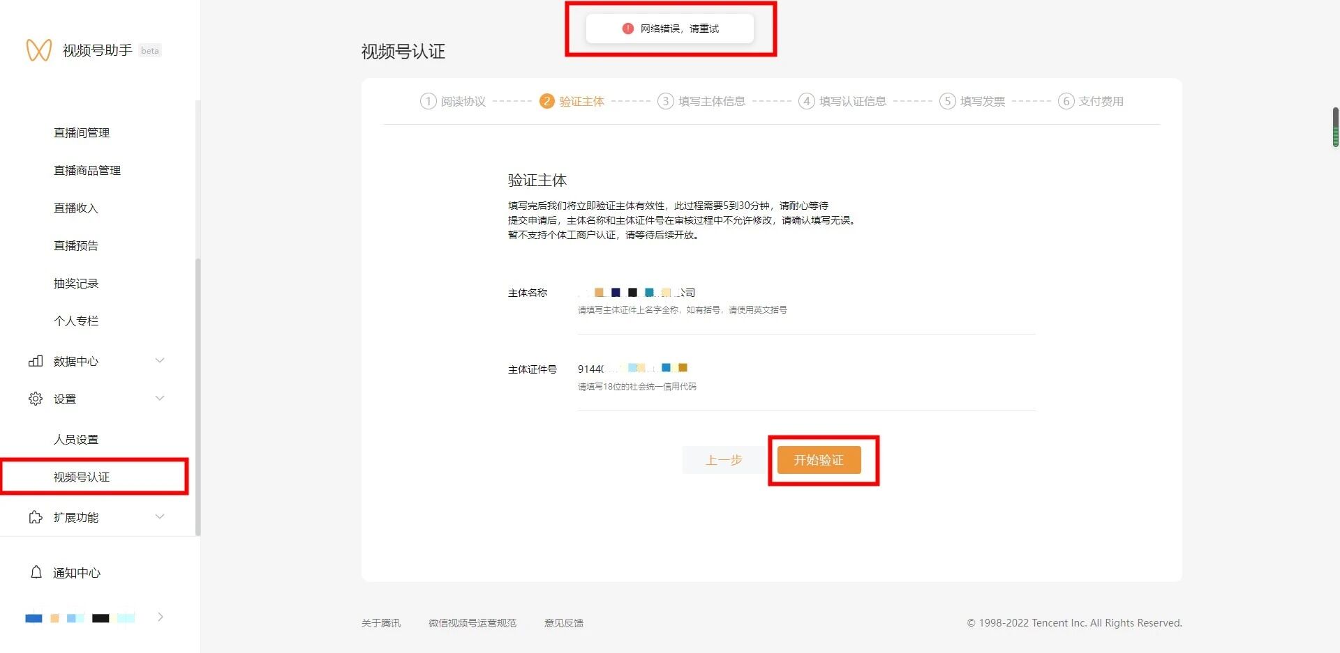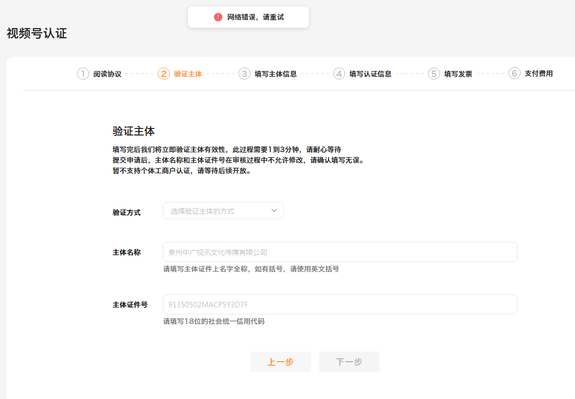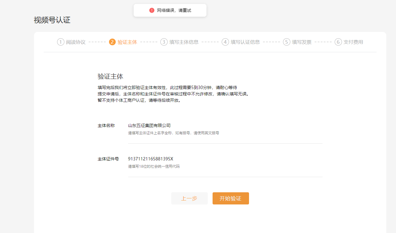 4、问题描述:视频号企业认证时候,显示网络错误,请重试