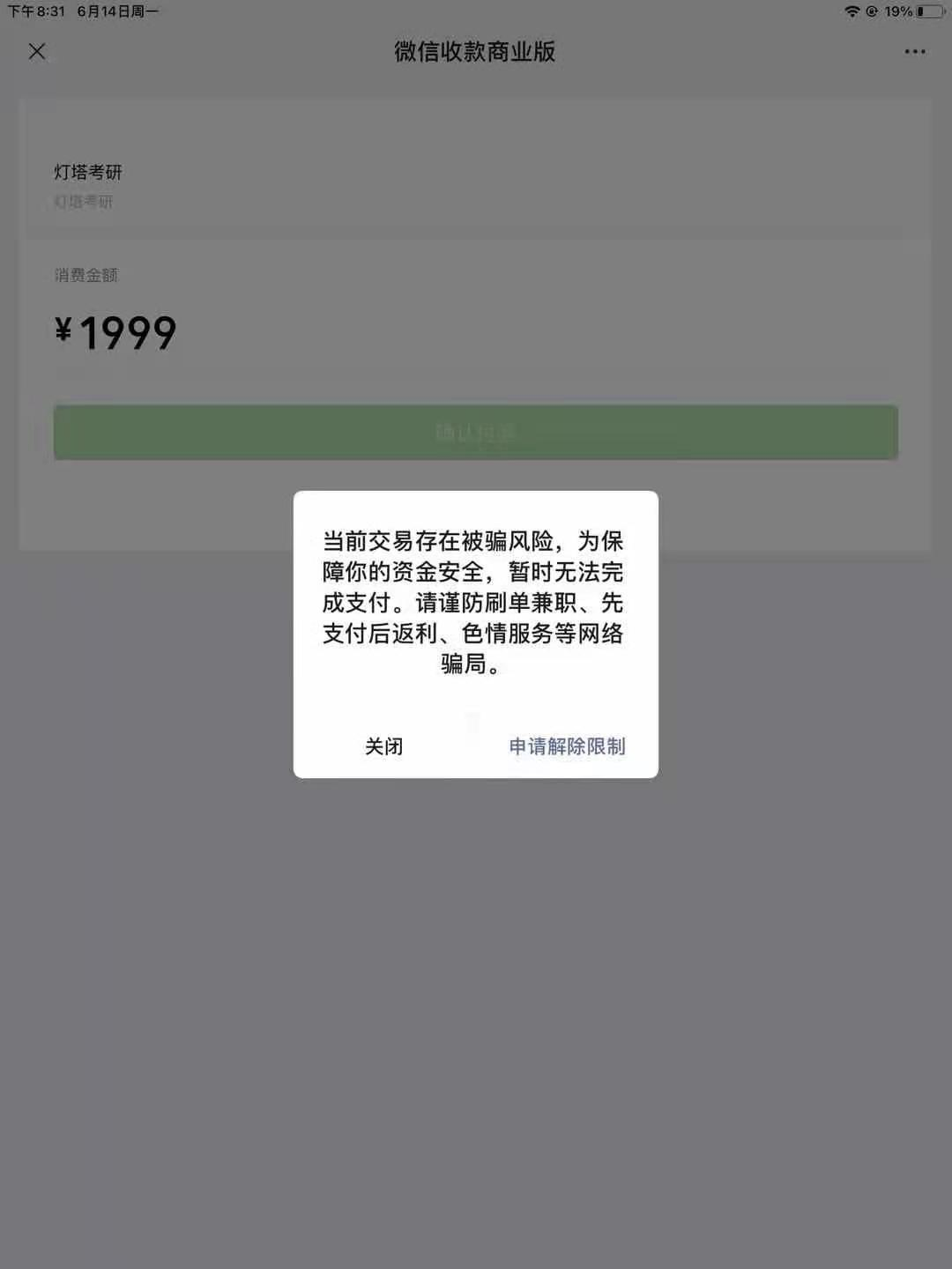 商户号:1544213421,刚申请下来的商户号,支付对接好后点击链接无法交易,直接弹出图上样式弹窗内容,提示“该笔交有被骗风险,刷单兼职、二手交易等是常见的欺诈手段,请谨慎支付”,这个问题之前反馈给微信客服过,最后还是没有解决,反馈的结果的通知在下方