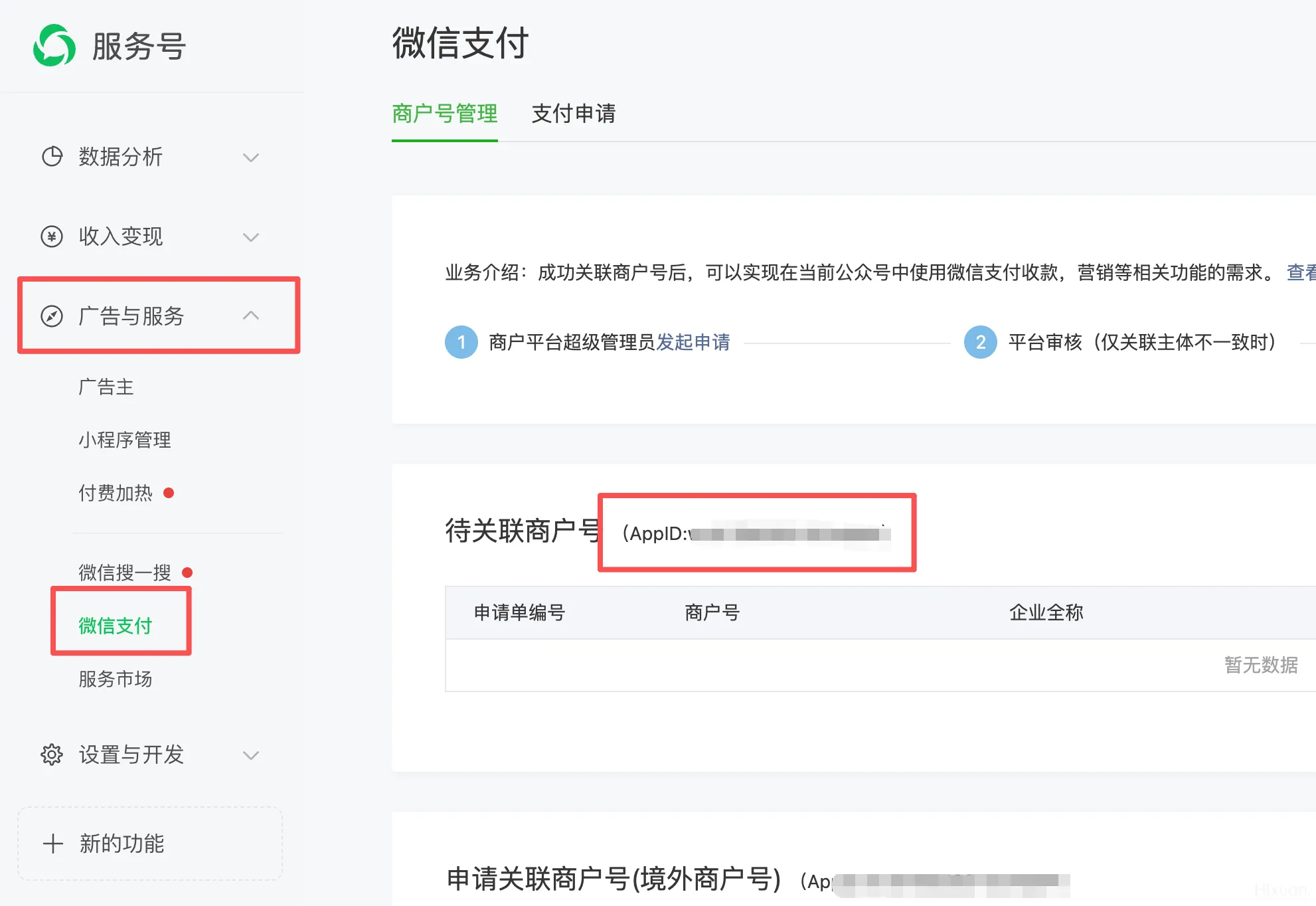 你可以点击左侧菜单【广告与服务 -> 微信支付】查看Appid哈。